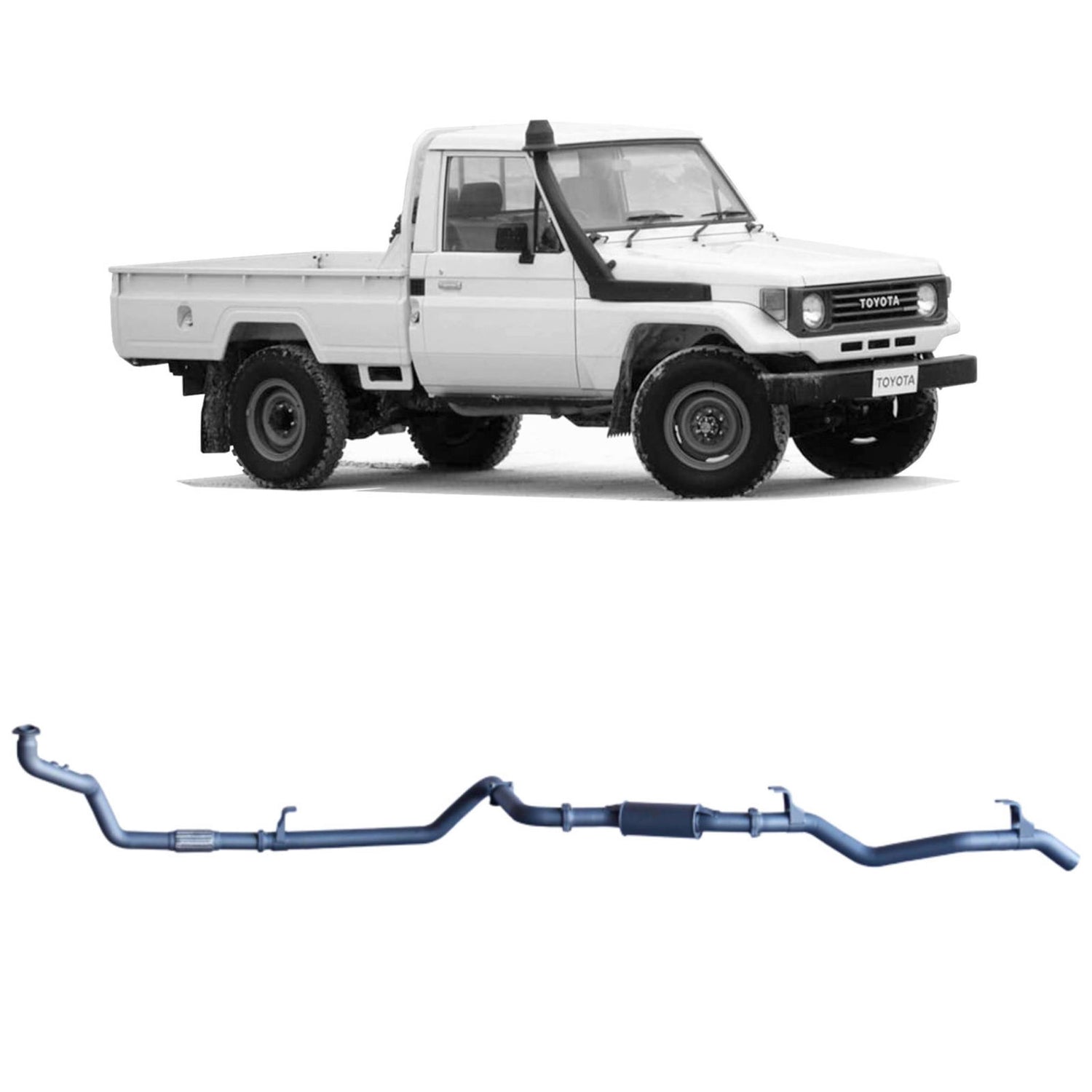 Redback Extreme Duty Exhaust to suit Toyota Landcruiser 75 Single Cab and 78 Series Troop Carrier.  Suits Vehicles with Leaf Front Suspension, 1HZ 4.2L with standard 1HZ Manifold.
