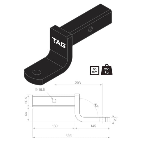 TAG - Tow Ball Mount - 203mm Long, 90° Face, 50mm Square Hitch