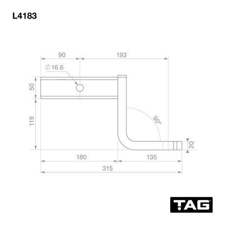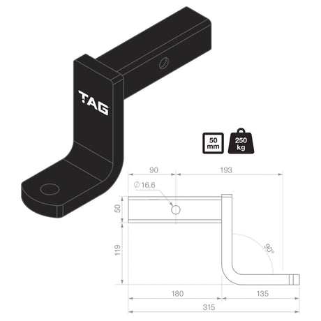 TAG - Tow Ball Mount - 193mm Long, 90° Face, 50mm Square Hitch