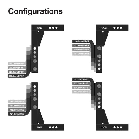 TAG - Adjustable Heavy Duty Tow Ball Mount 90° Face, 50mm Square Hitch - 310mm Drop, 335mm Rise